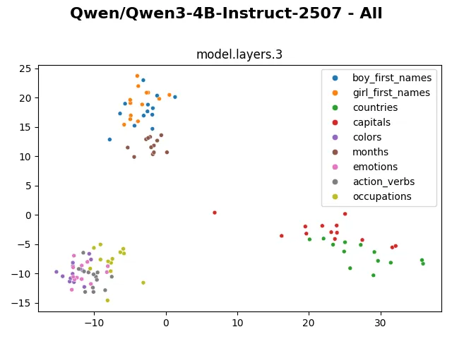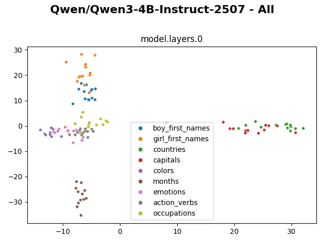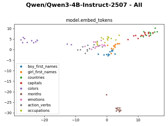 Specifically, we will visualize categories of words to see whether the embedding and hidden representation of cluster according to their category, using the Qwen3-4b-Instruct model. The following words will be examined: