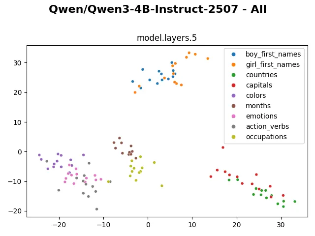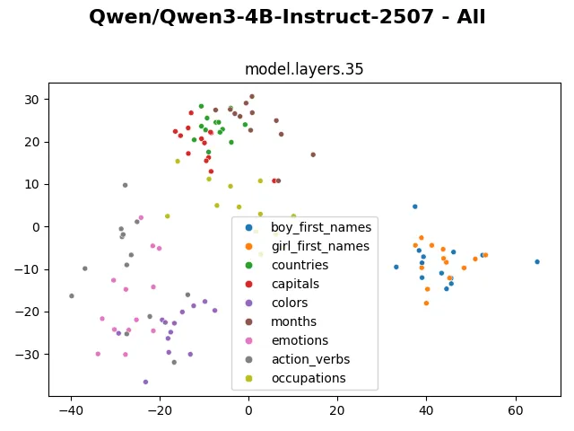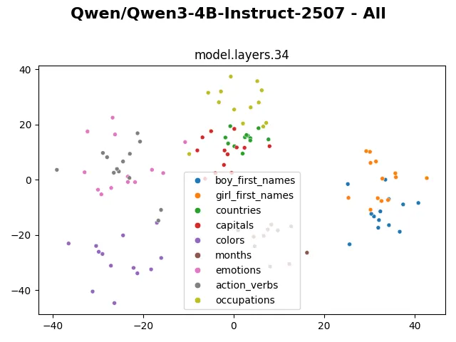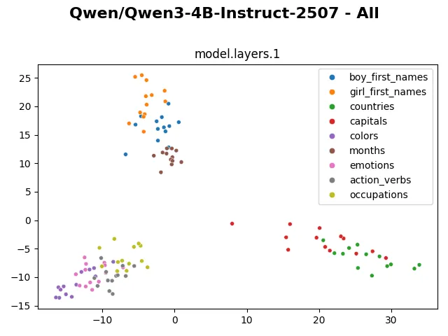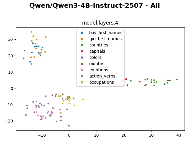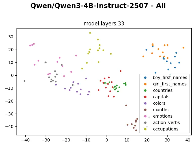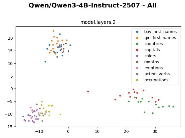 Looking at the visualization from larger models (such as gpt-oss-20b, gpt-oss-120b, olmo3-7b,…) also shows that the embedding and hidden representation of such categories are distinctly preserved. The clusters even remain distinctive in the representation of the last layer. I wonder if through these visualizations, we can in some way compare model capability, similar to how the fractured representation hypothesis shows a much cleaner representation of evolutionary-trained models compared to backprop-trained models.