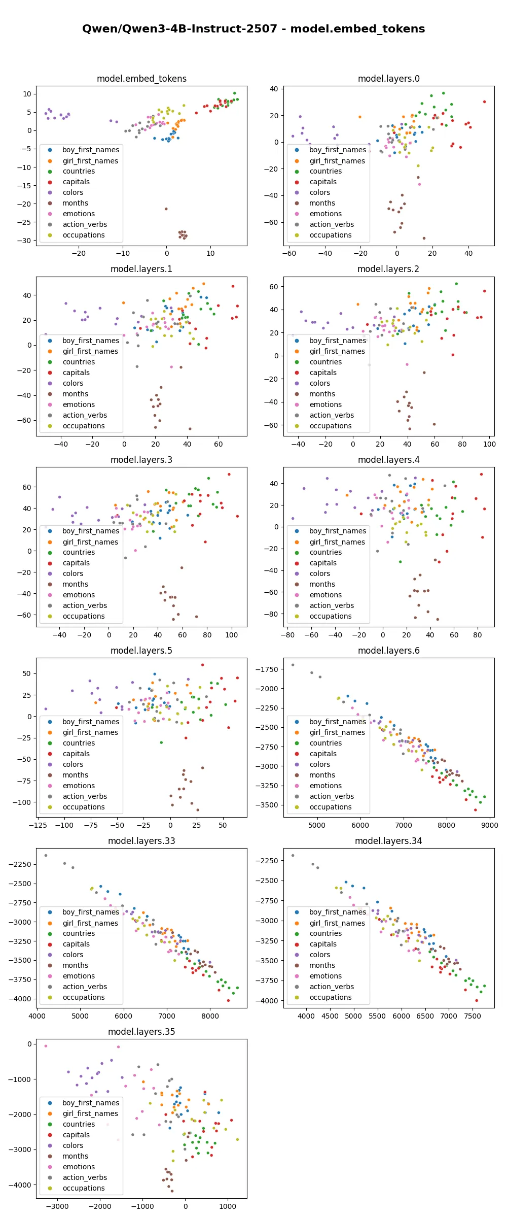 When each layer is plotted against the PCA projection of embedding layers, we can see the tokens gradually scatter in the first few layers, then become linear and grow greatly in scale from layer 6 onward. Related tokens still stay close to each other. Among these plots, the “linearization” of representation looks interesting. This behavior similarly shows up in other models of the Qwen3 family, but not in other families such as gpt-oss. I wonder how the training data and training strategy contribute to this phenomenon.
